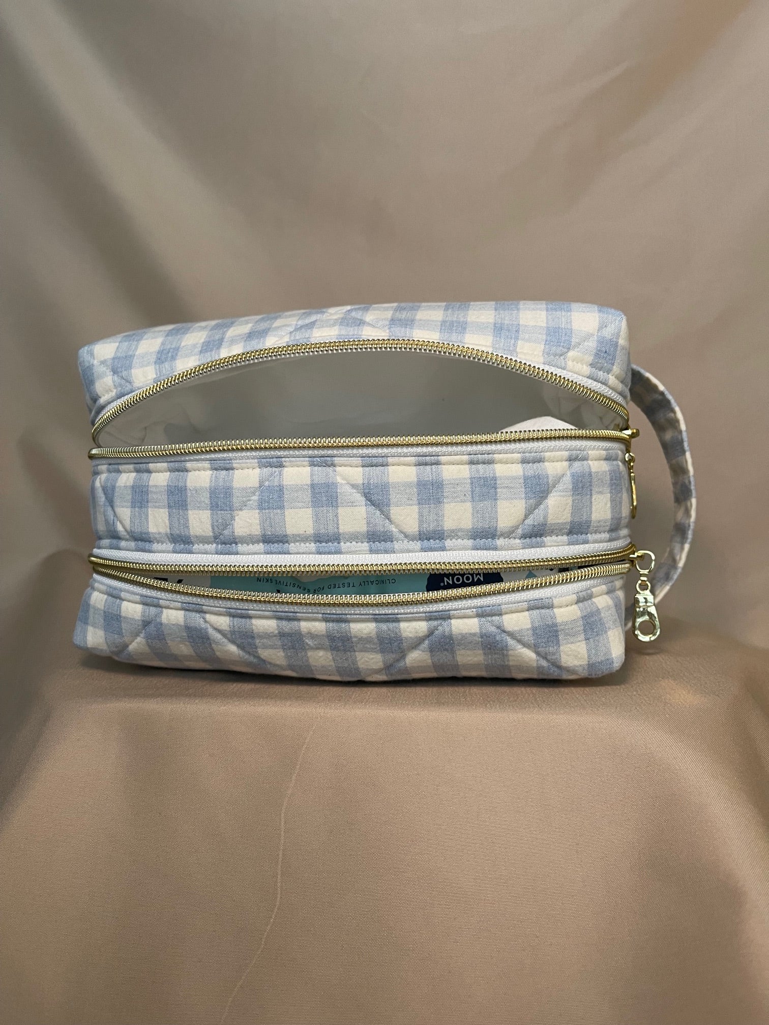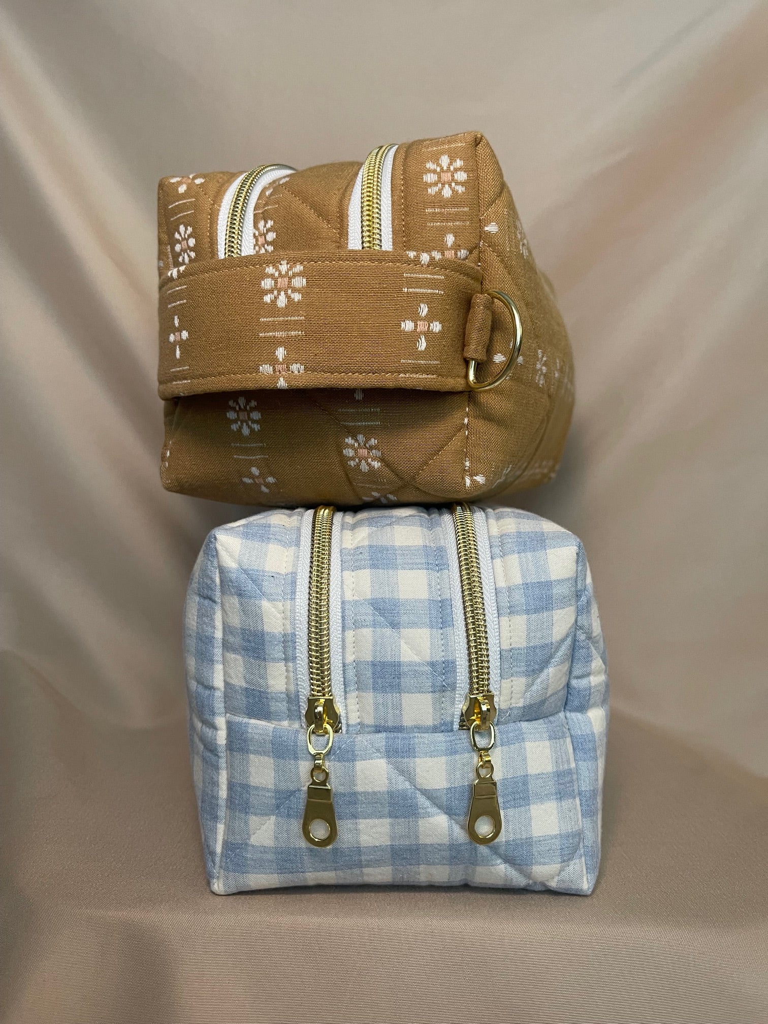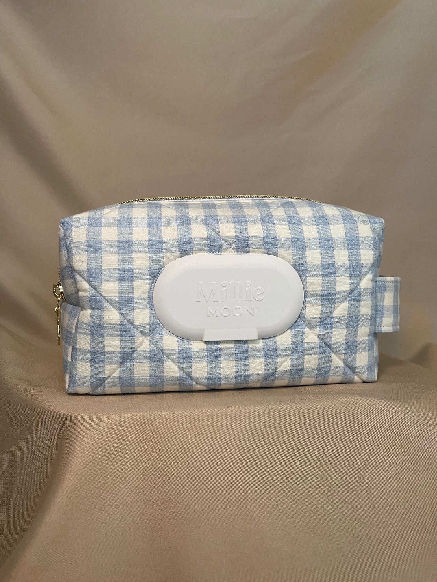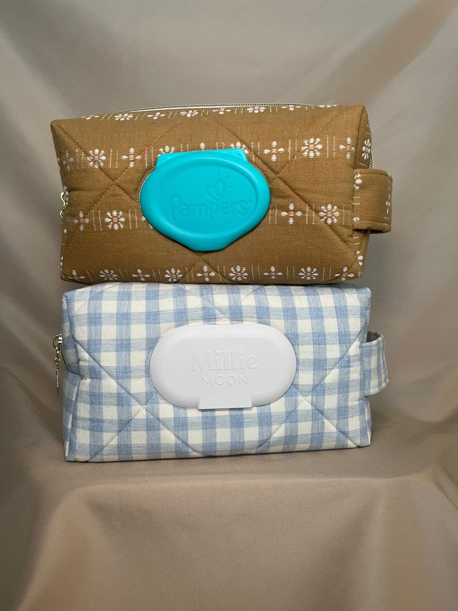 the custom basic wipe bag is made from 100% cotton fabric and reinforced with a foam to keep the bag sturdy and structured, this bag is designed to be durable, useful and stylish. it features a sturdy, canvas-lined handle and a D-ring to hook onto your bag or stroller. the bag comes with two zippered compartments: one specially designed to hold your favorite brand of wipes, and another to hold diapers, snacks, or any other essential you need to take on the go. these are absolutely perfect for parents on the go or for the days you don't want to be carrying a full diaper bag!