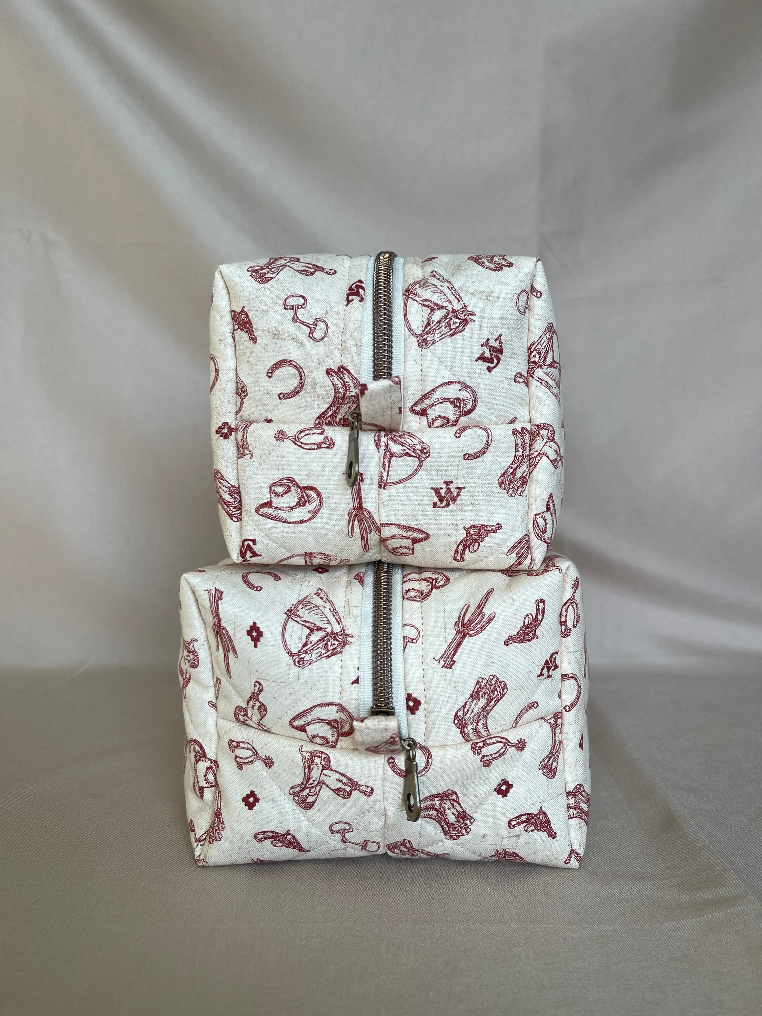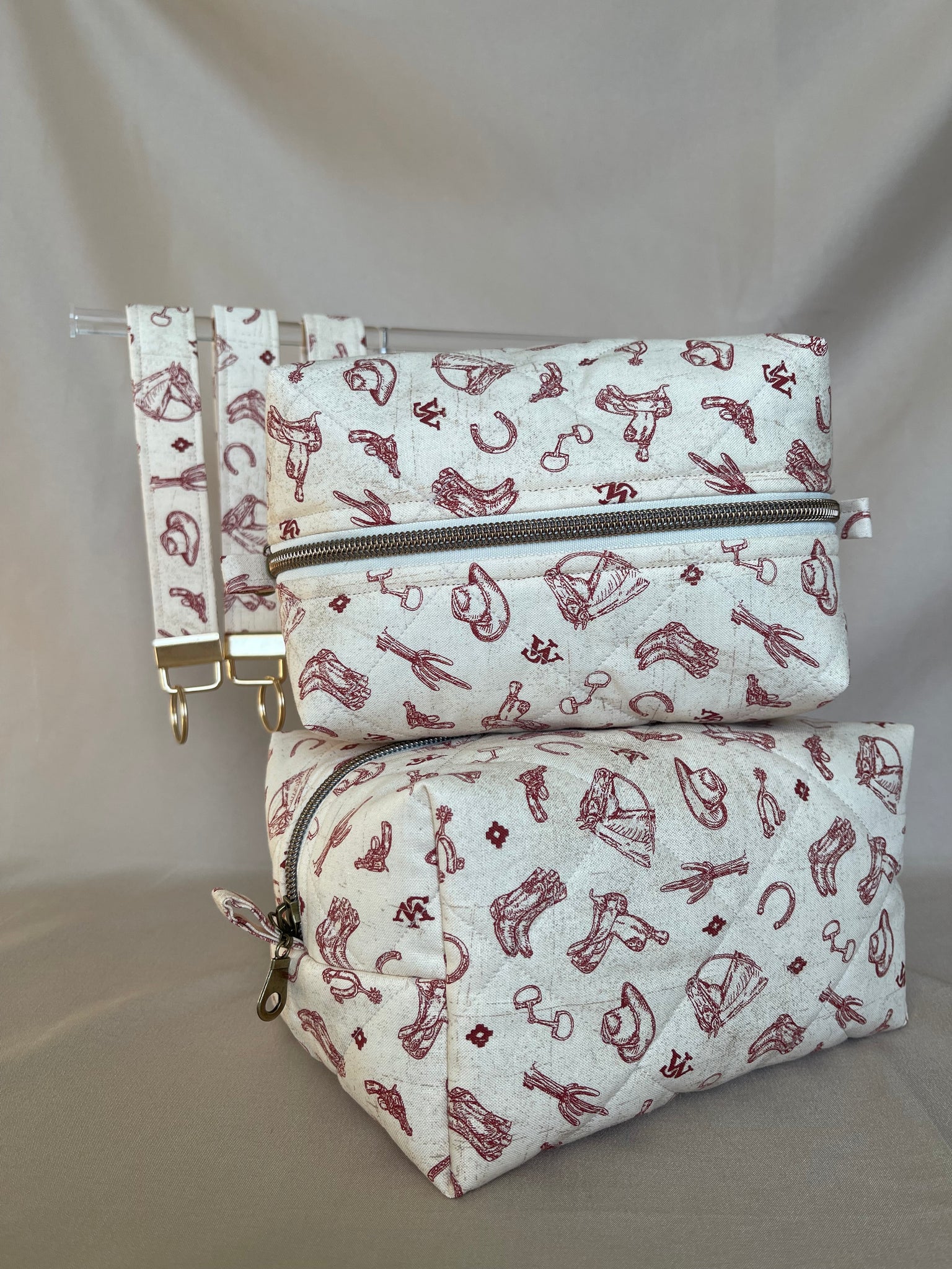 the quilted makeup bag sets are the perfect mix of style and function! the western quilted makeup bags are made from 100% cotton fabric, quilted with hi-loft polyester batting for a structure and softness, and finished with a smooth zipper closure. plus pull tabs on either end for easy use and an elevated touch! don't forget to add the matching keychain while in stock!