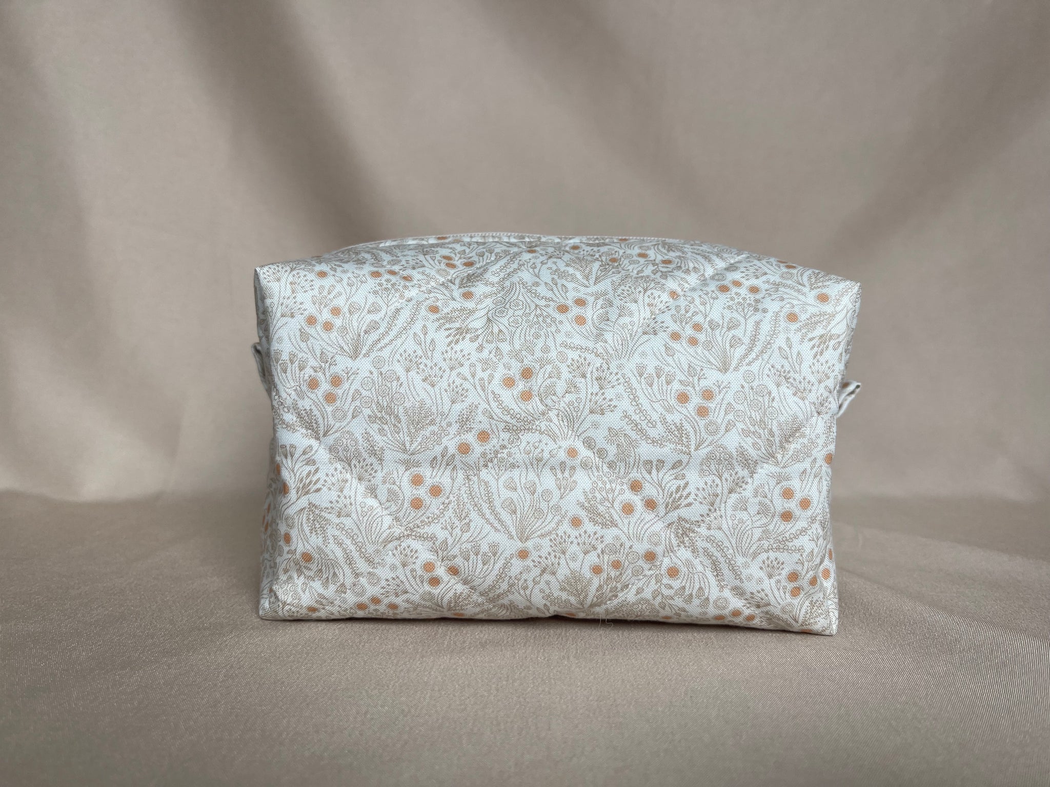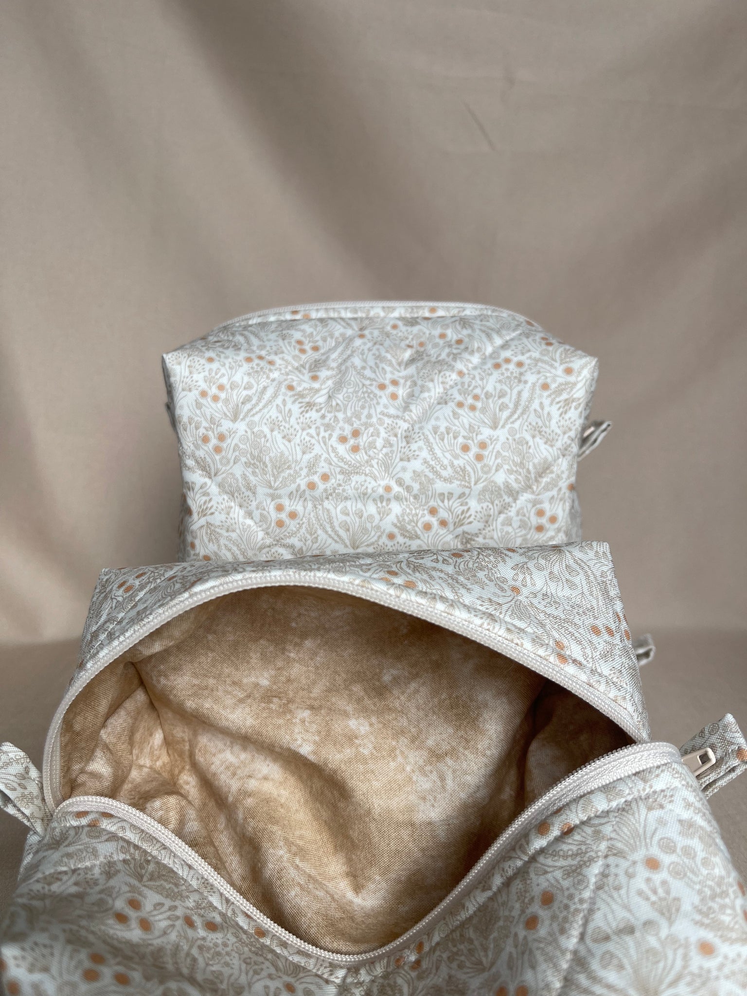 the quilted makeup bag sets are the perfect mix of style and function! the neutral florals makeup bags are made from 100% cotton fabric, quilted with hi-loft polyester batting for a structure and softness, and finished with a smooth zipper closure. plus pull tabs on either end for easy use and an elevated touch! available in three sizes (small-large) these bags are designed to fit your needs. use the small for everyday touch ups. the medium for weekend getaways, and the large for keeping your full routine in one place. don't forget to add the matching keychain while in stock!