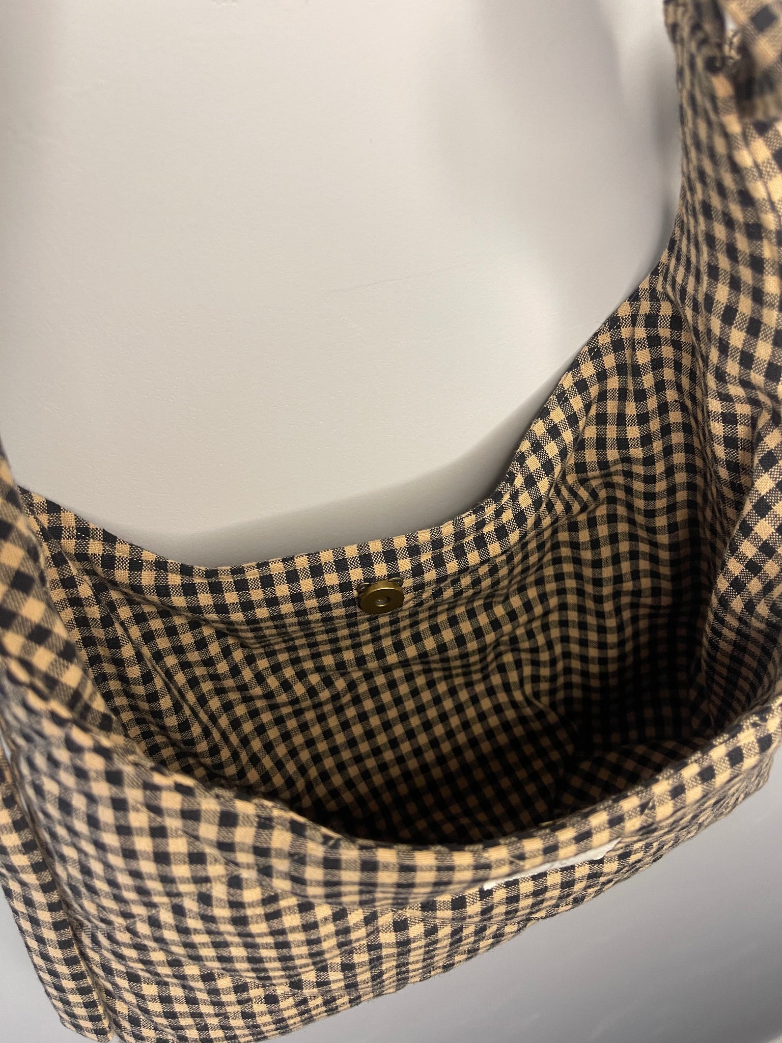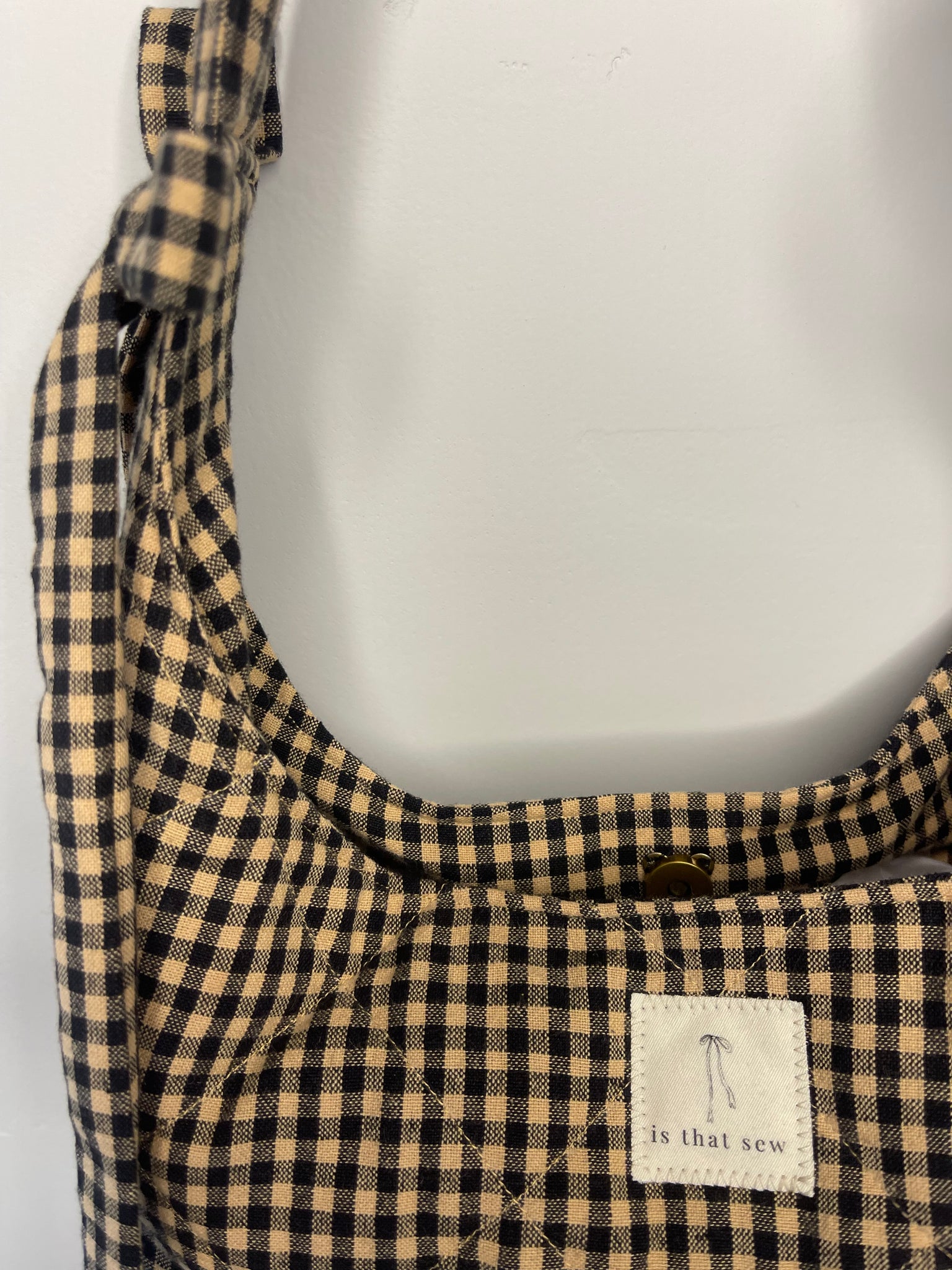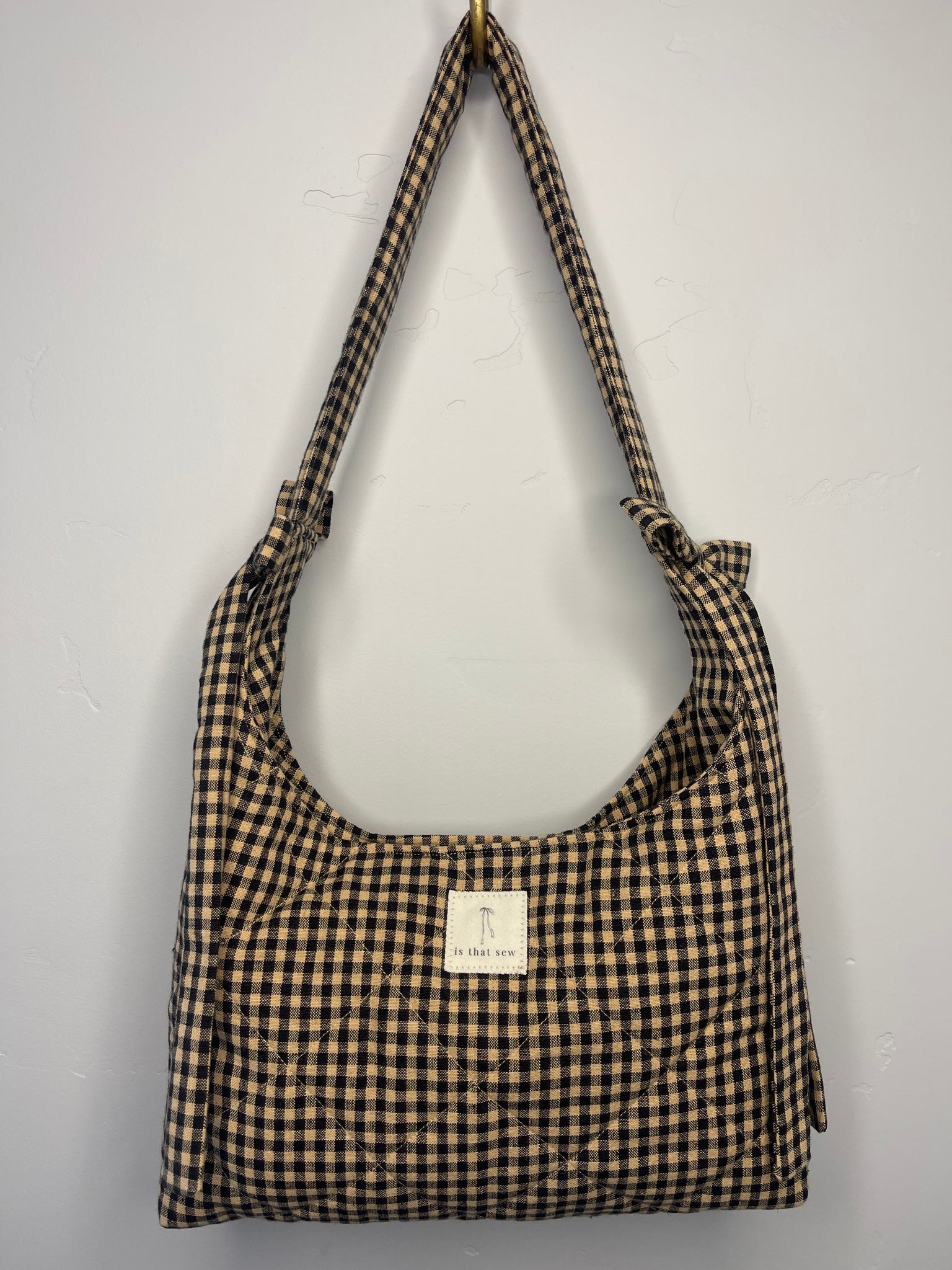 this mini quilted shoulder bag is sewn from 100% cotton fabric for a softer quilted look compared to the duck cloth. this bag was quilted with hi loft polyester batting and lined with matching fabric. a brass magnetic clasp keeps all your essentials secure and bow details stitched on either end for the sweetest touch.