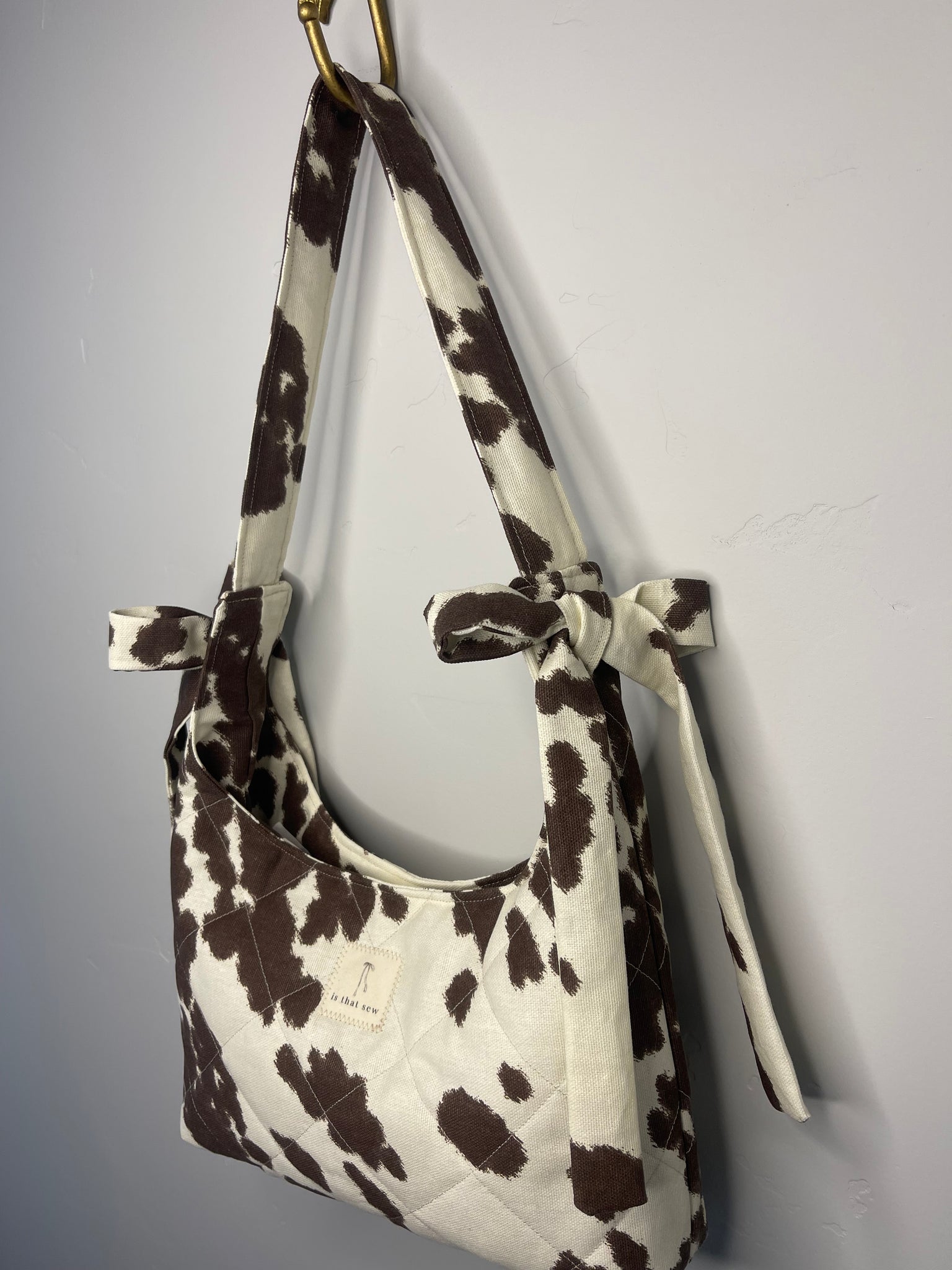 this mini quilted shoulder bag is sewn from 100% cotton duck cloth - a sturdy, canvas like fabric that adds structure to the bag and extra dimension to the quilted details. this bag was quilted with high loft polyester batting and lined with matching fabric. a brass magnetic clasp keeps all your essentials secure and bow details stitched on either end for the sweetest touch.