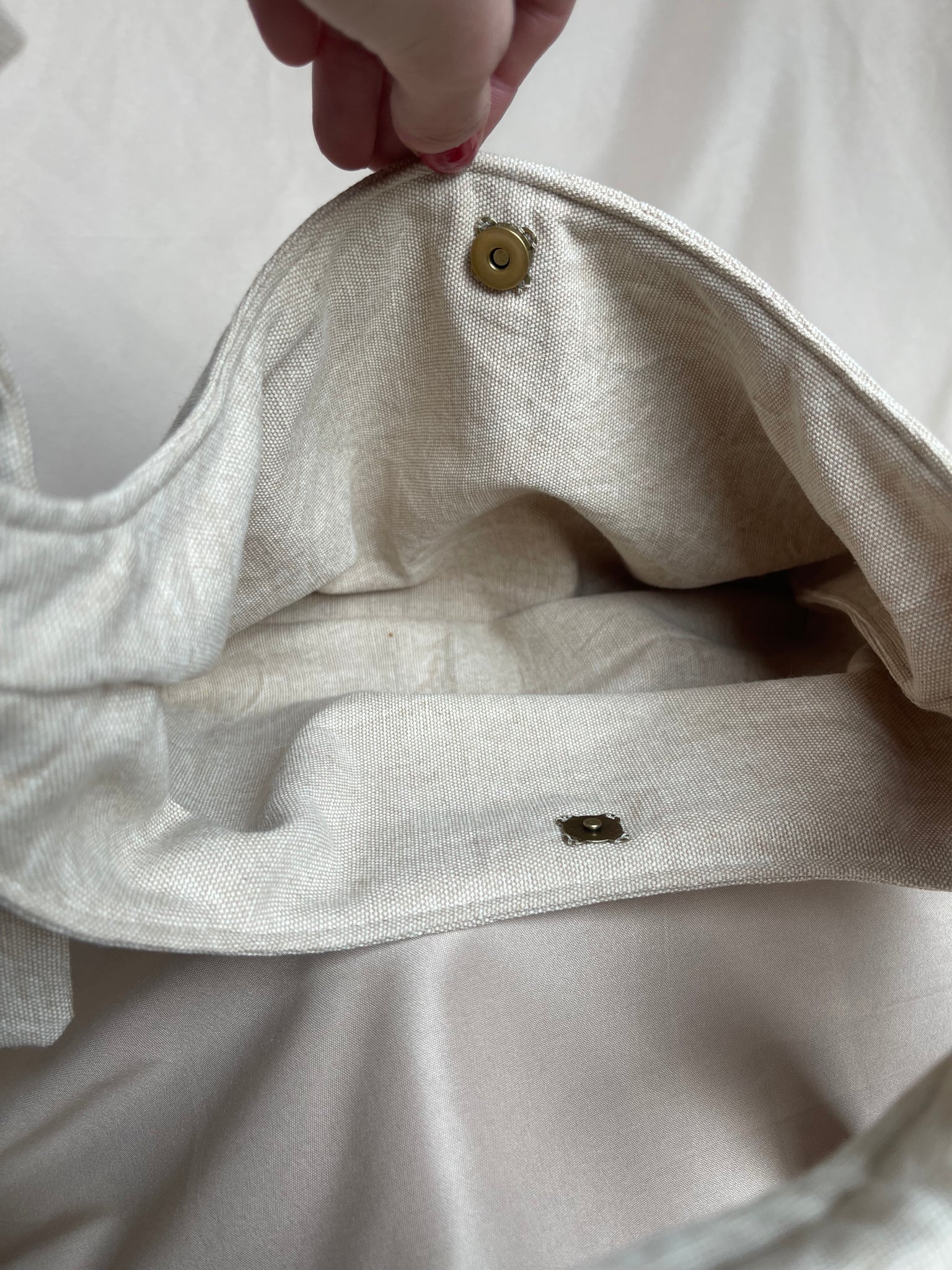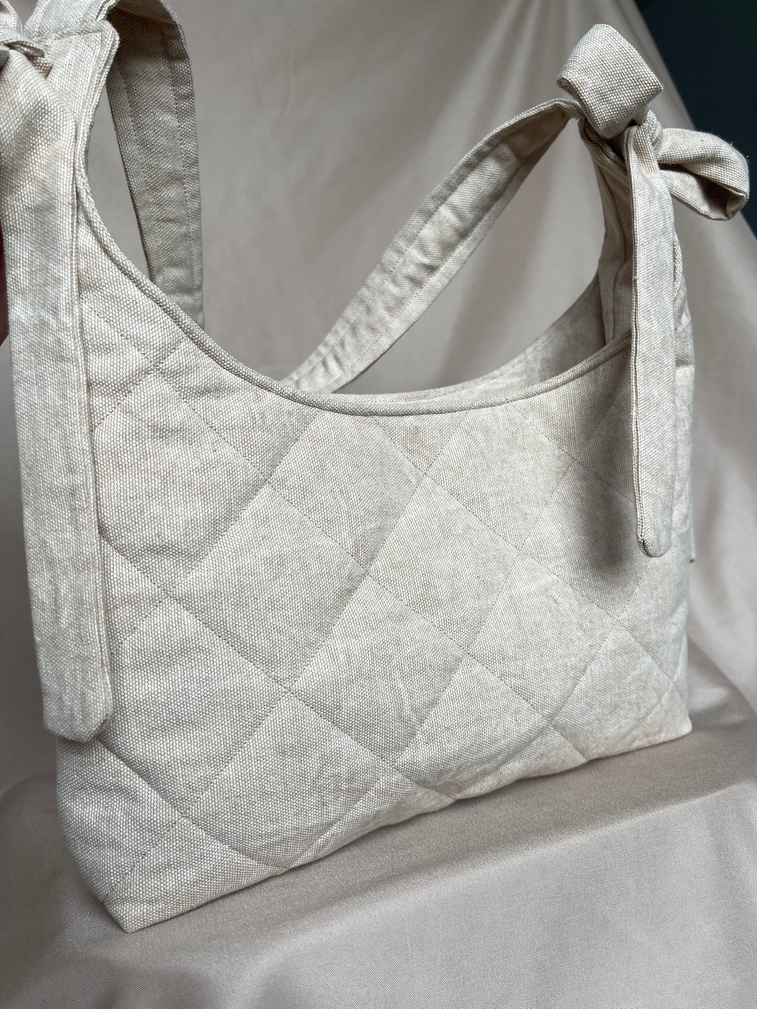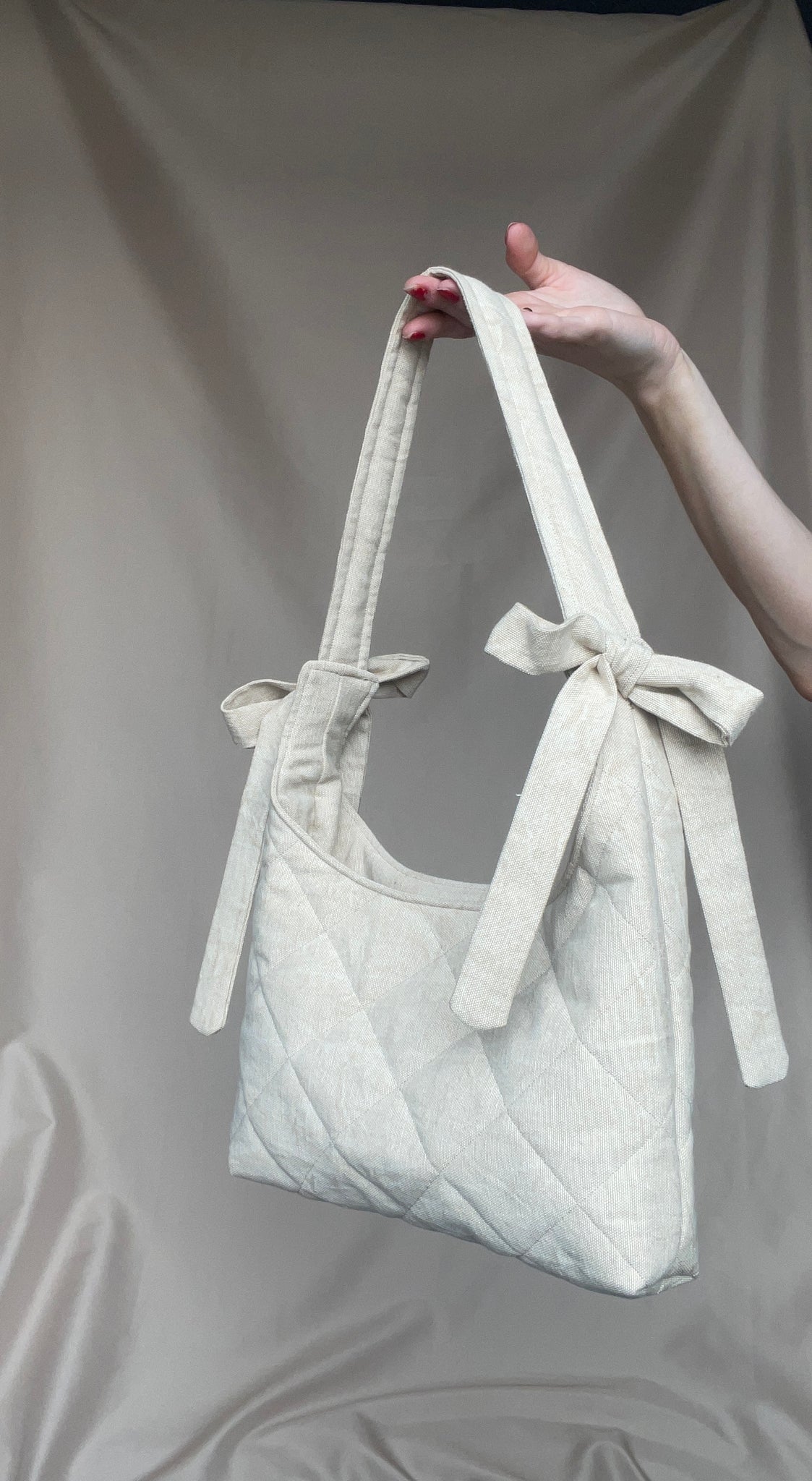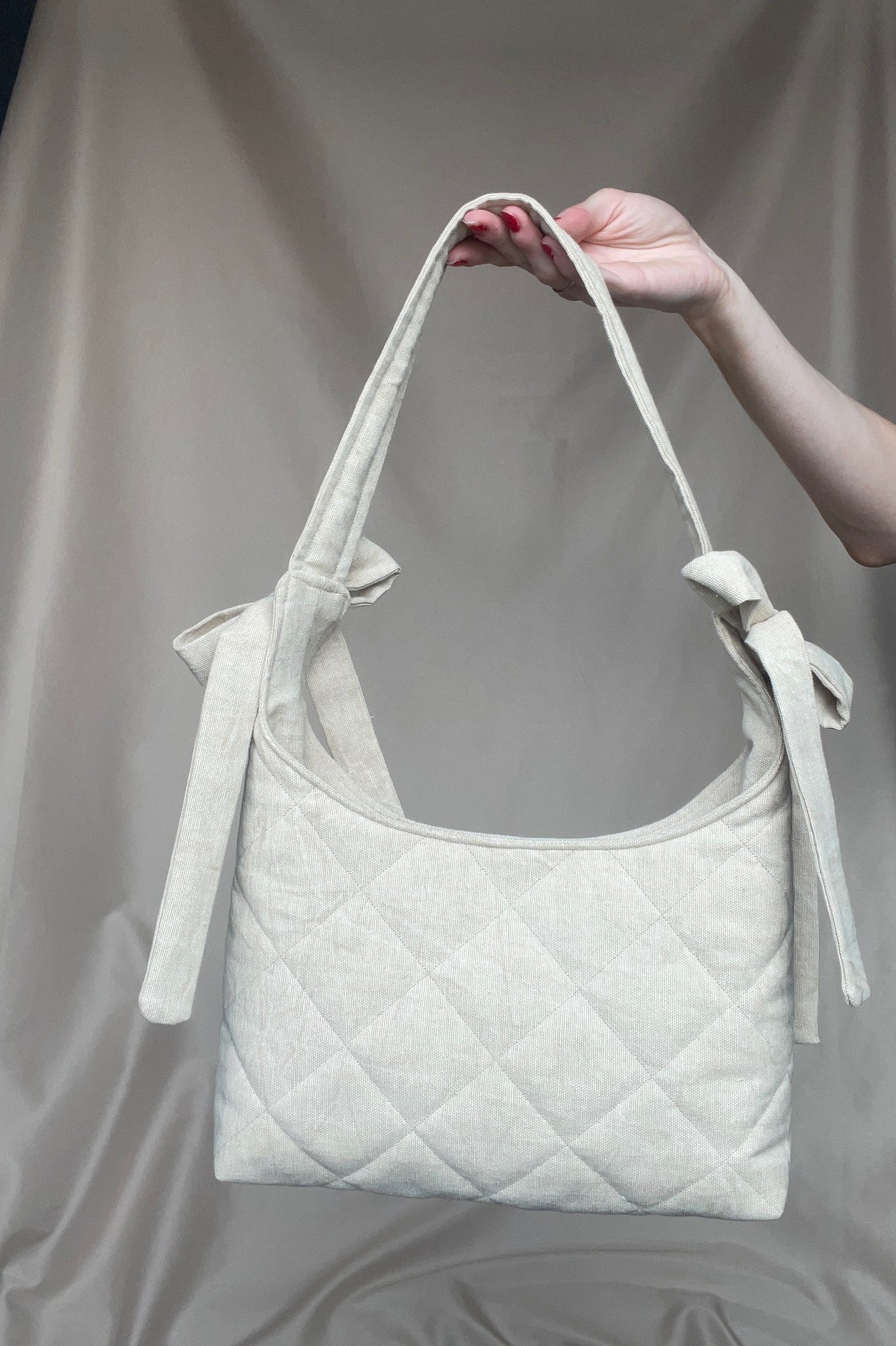 this mini quilted shoulder bag is sewn from 100% cotton duck cloth - a sturdy, canvas like fabric that adds structure to the bag and extra dimension to the quilted details. this bag was quilted with high loft polyester batting and lined with matching fabric. a brass magnetic clasp keeps all your essentials secure and bow details stitched on either end for the sweetest touch.