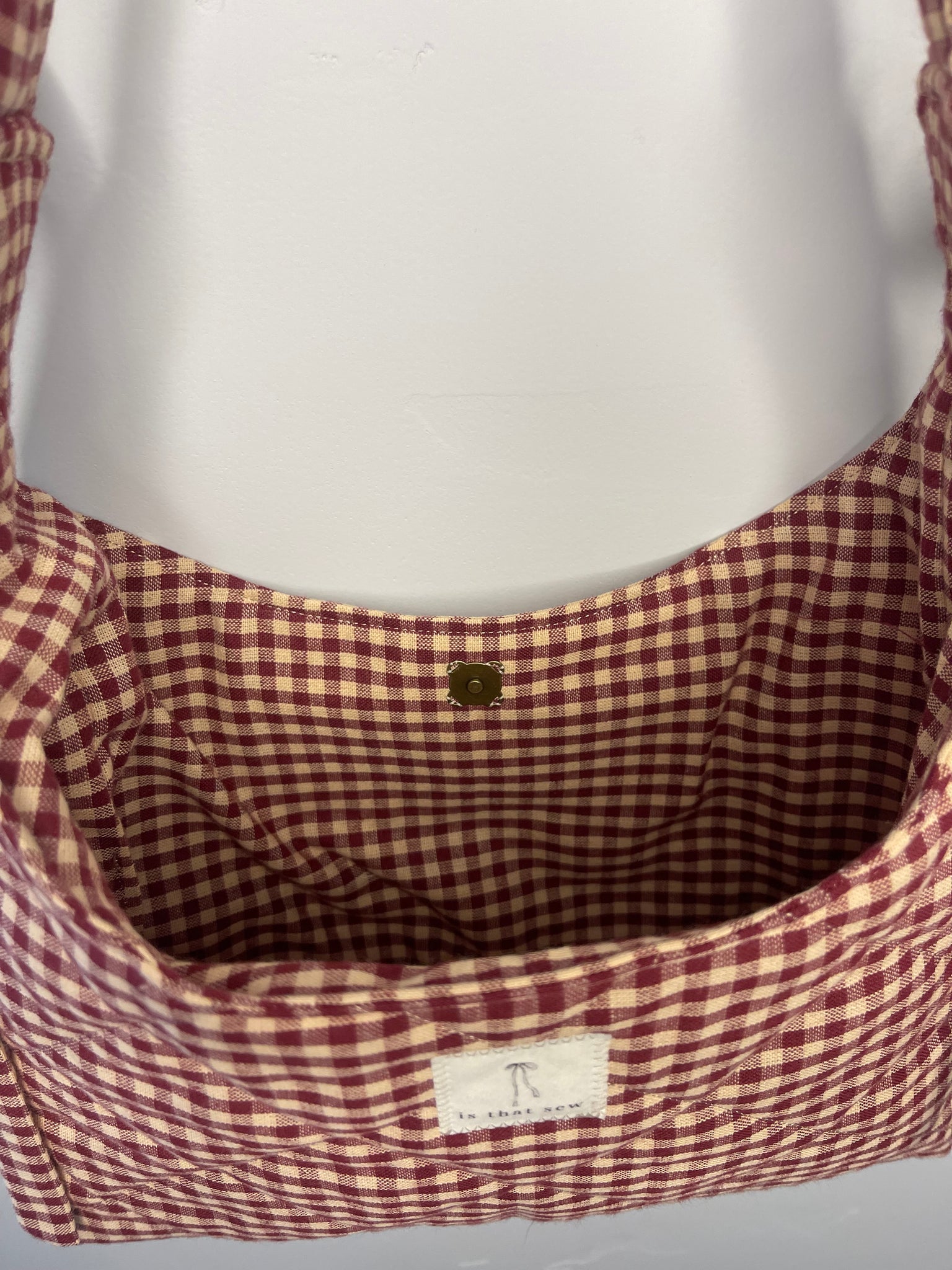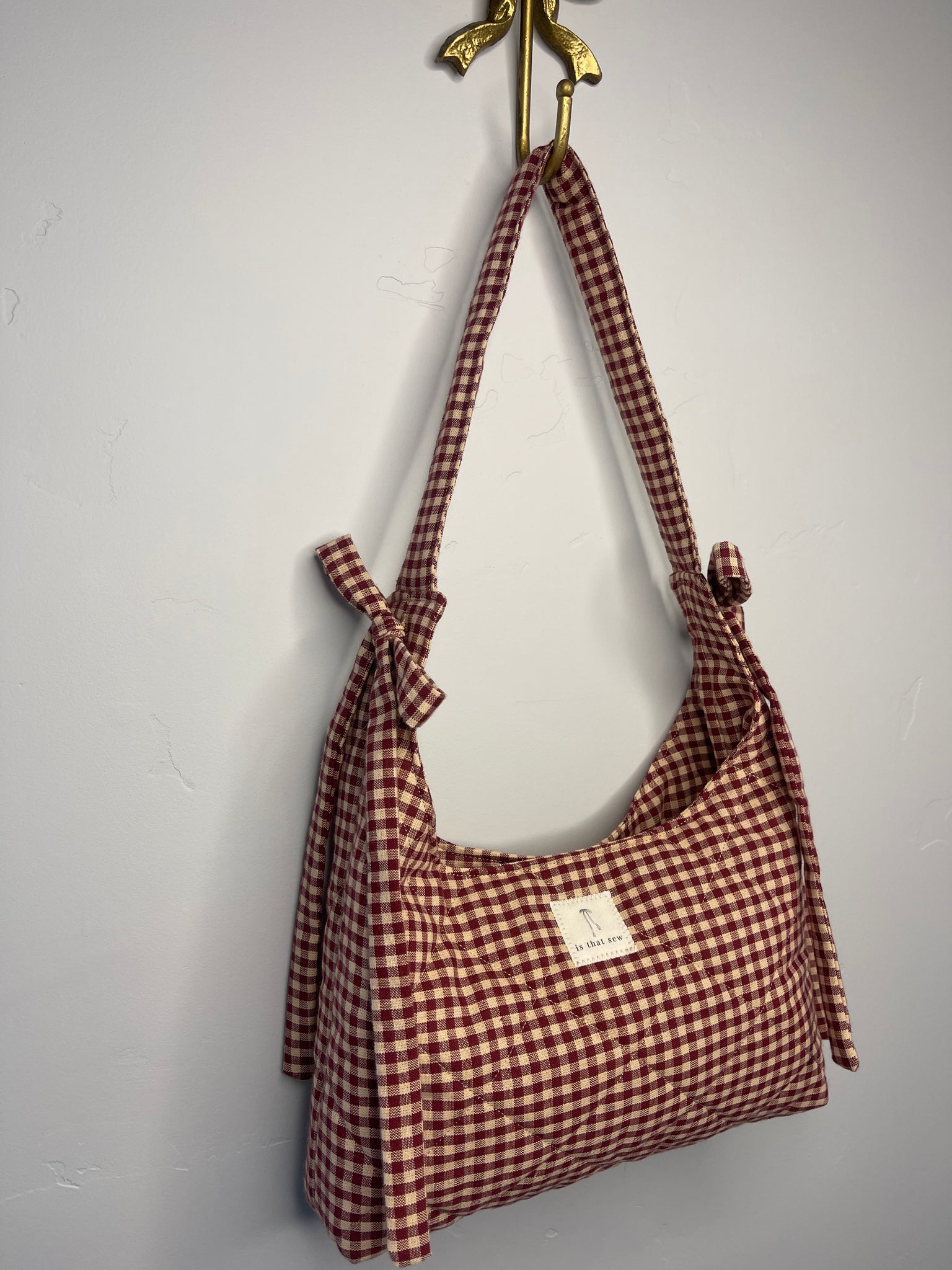 am i allowed to pick favorites from a collection...because this one is mine! this mini quilted shoulder bag is sewn from 100% cotton fabric for a softer quilted look compared to the duck cloth. this bag was quilted with hi loft polyester batting and lined with matching fabric. a brass magnetic clasp keeps all your essentials secure and bow details stitched on either end for the sweetest touch.