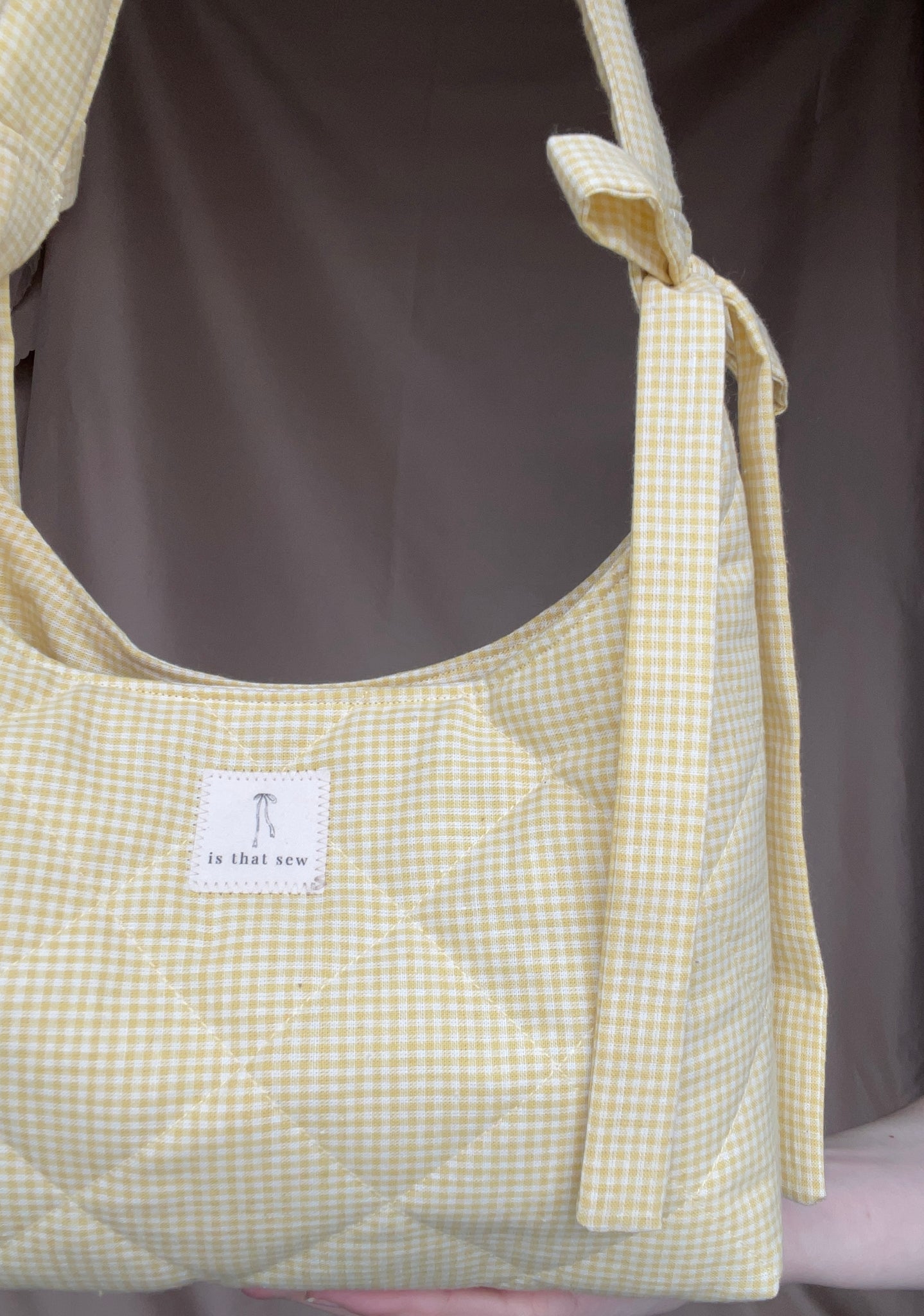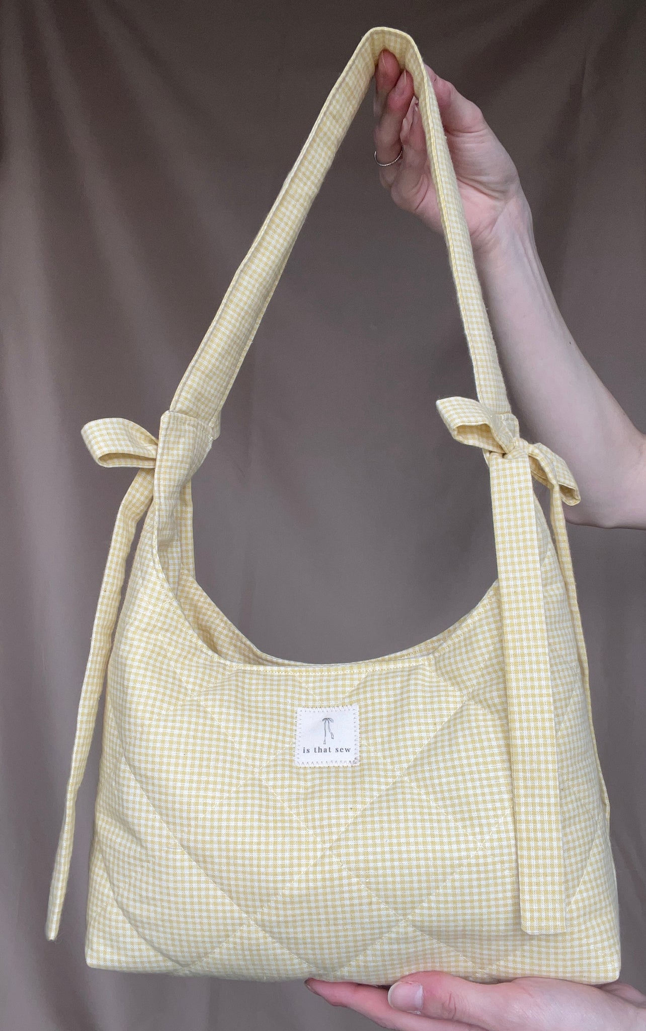 this mini is completely one of a kind as it is made from a vintage, 100% cotton fabric and was quilted with hi loft polyester batting. a brass magnetic clasp keeps all your essentials secure and bow details stitched on either end for the sweetest touch. i will not be able to restock this bag, so once it's gone, it's gone!