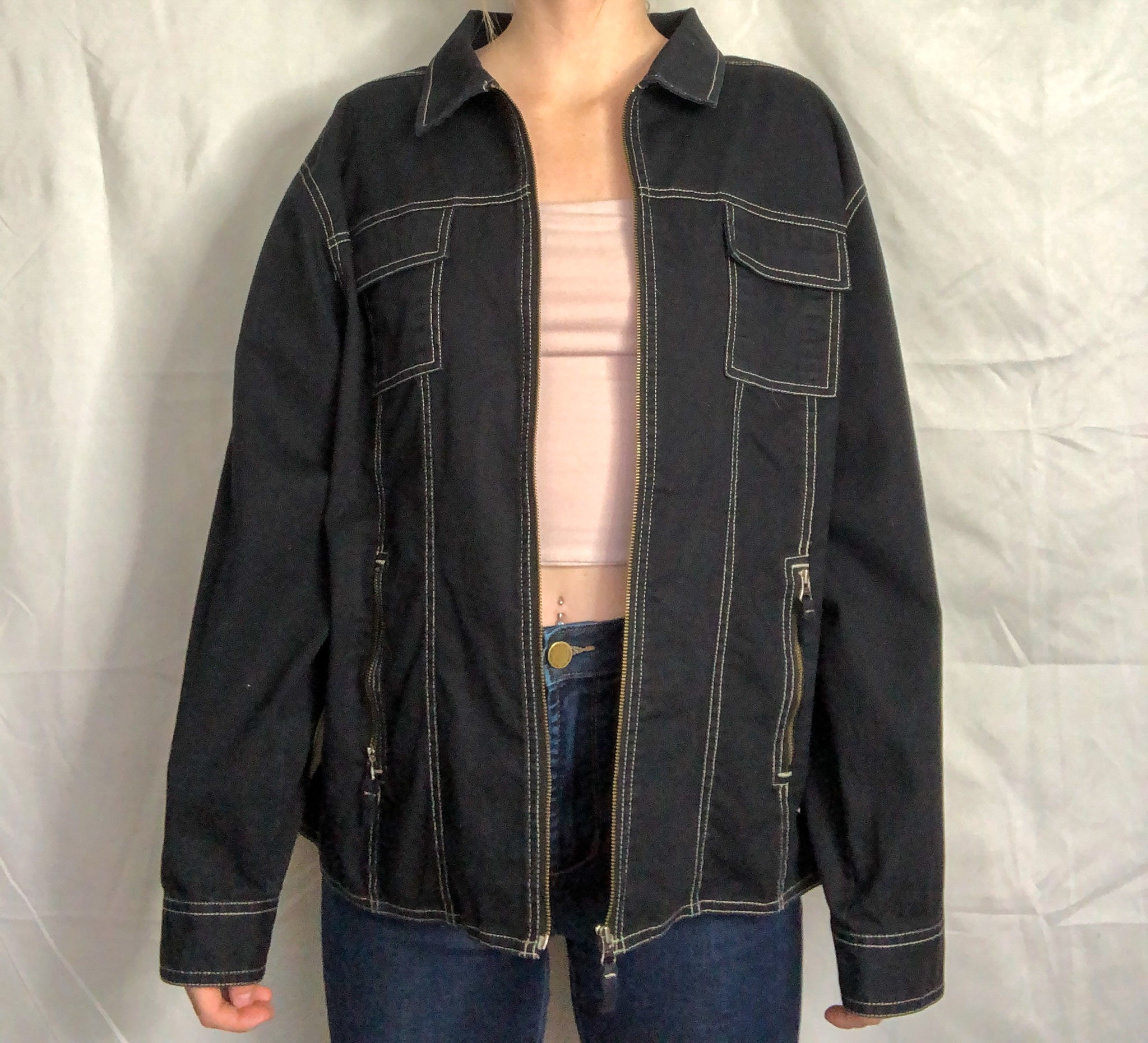 This jacket has a front zip up instead of buttons and two breast pockets as well! It is a fairly thin jacket as well!